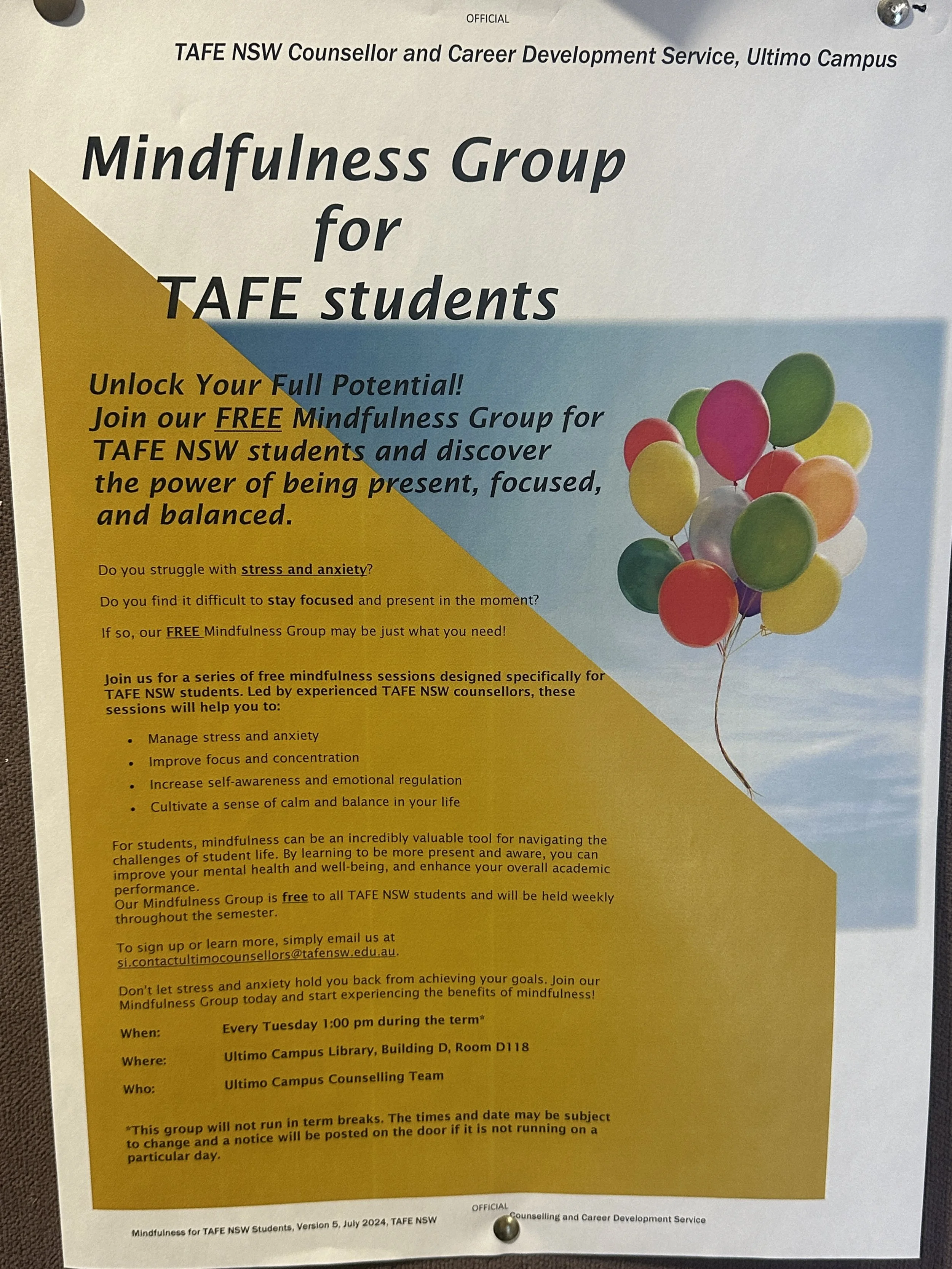 On the TAFE campus in Ultimo, the counselling department is foundational for promoting positive mental health and support for students. This includes counselling sessions and, recently, a weekly Mindfulness Group.